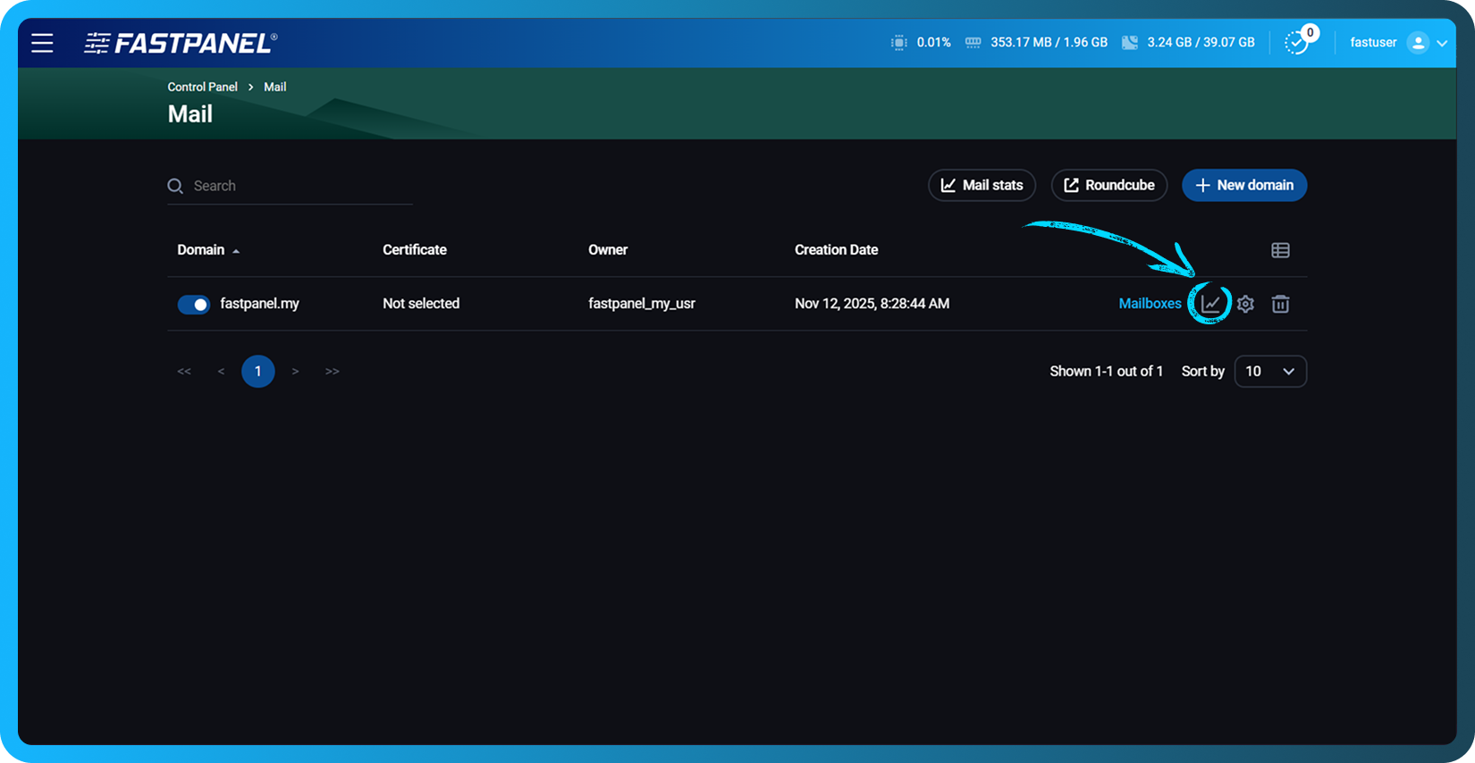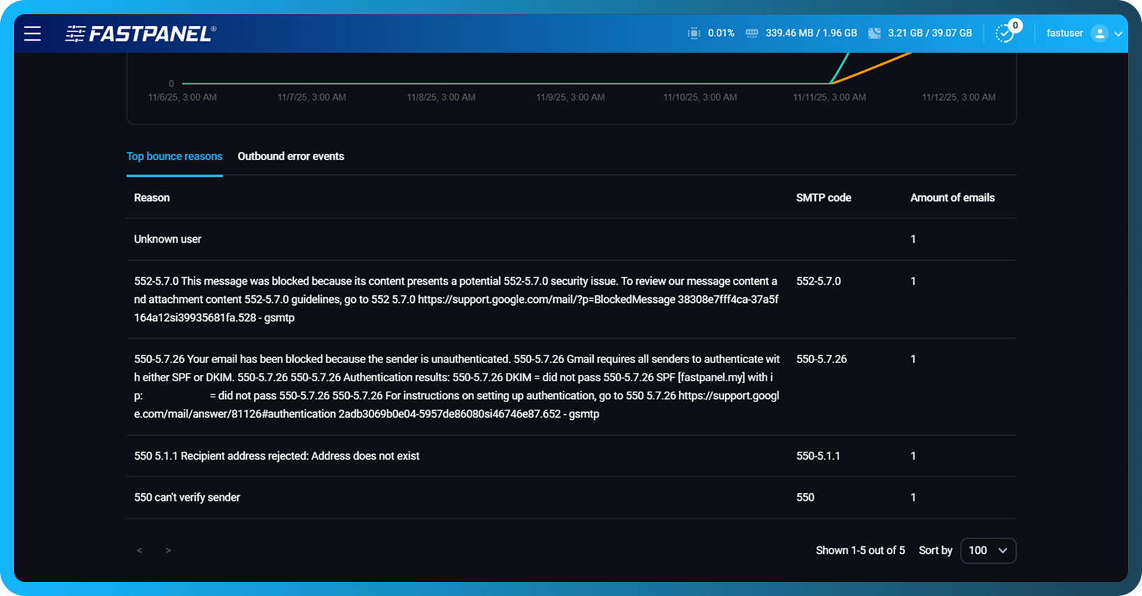 FASTPANEL® obsahuje funkci Statistiky pošty, která vám umožňuje snadno sledovat aktivitu odchozích e-mailů pro celou doménu nebo jednotlivé poštovní schránky. Můžete rychle zjistit, kolik zpráv bylo odesláno, doručeno nebo vráceno, a zobrazit podrobné chybové kódy SMTP s doporučeními vysvětlujícími, proč byly některé e-maily odmítnuty.